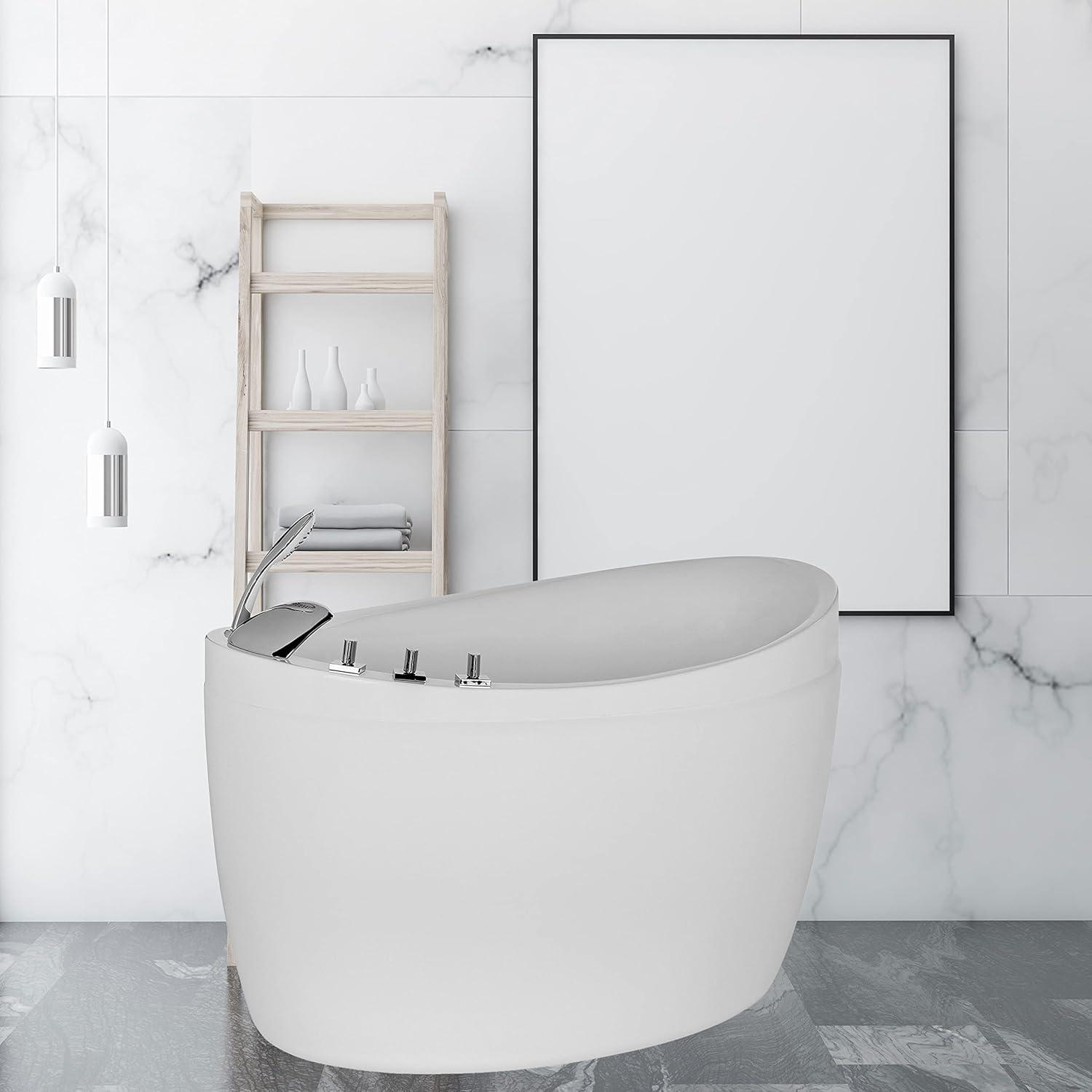 The 59″ Japanese style air jets soaking tub is a perfect combination of style and practicality. It’s made out of 100% glossy white acrylic and reinforced with fiberglass for long lasting durability. The freestanding style provides a clean and efficient use of space in your master bath allowing for an open environment unrestricted by walls and barriers. It uses air pump to push pressurized air into the tub, release thousands of bubbles to massage your body, yielding a gentler, more soothing experience. During the past years, EMPAVA air jets soaking bathtub have been a very popular choice for bathroom upgrades and new builds.